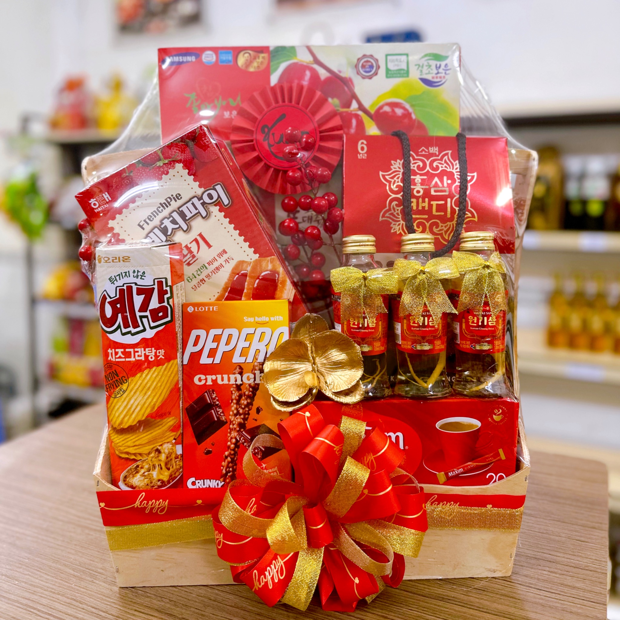 Giỏ quà A10, Bao gồm:1. Bánh quy Chocolate nhân nếp dẻo CW Hàn Quốc (240g)2. Táo đỏ sấy khô Samsung Hàn Quốc (1kg)3. Bánh nướng French Pie mứt dâu Haitai Hàn Quốc (192g)4. Bánh snack khoai tây Orion Hàn Quốc vị phô mai...