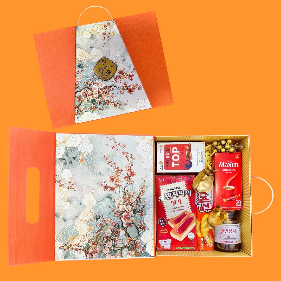 Giỏ quà H03, bao gồm: 1. Kẹo hồng sâm không đường T.O.P Daesan Hàn Quốc (hộp 200g)2. Bánh nướng French Pie mứt dâu Haitai Hàn Quốc (192g)3. Bánh snack khoai tây Orion Hàn Quốc vị phô mai (64g)4. Cà phê hoà tan...